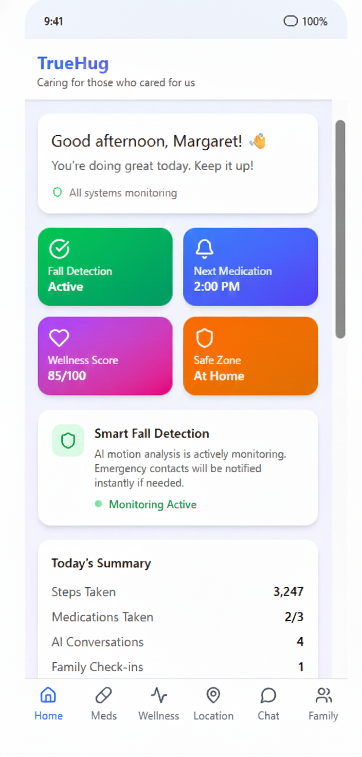 TrueHug provides periodic wellness checks and analyzes daily trends to offer insights into physical and emotional well-being—empowering proactive care without intrusive continuous surveillance.